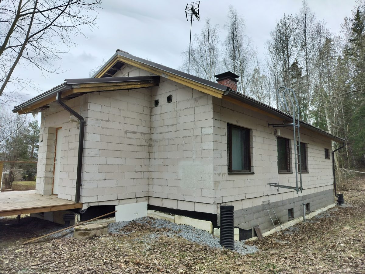 Tässä kohteessa tehtiin sekä ulkoverhouksen, että lisäeristeiden vaihto. 1980- luvulla tehty lisäeristys ja verhous oli tehty ilman tuuletusrakoa. Nyt vaihdamme lisäeristeen Isoverin Facade 75mm tuulensuojaeristeeseen ja ulkoverhous toteutetaan perinteisenä ”rakorima” verhouksena. Entisen sinisen talon tilalla on nyt kaunis vaalea talo.
