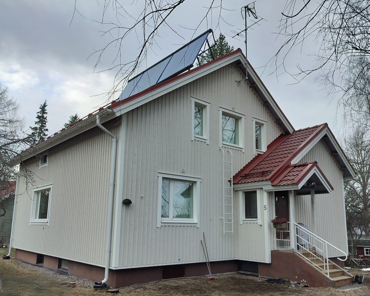 Vanhan omakotitalon ulkoverhous- ja kattoremontti. Vanha minerit verhous poistettiin, asennettiin Isover Facade tuulensuojaeriste ja sen jälkeen välimaalattu UTV-paneeli. Samassa yhteydessä uusittiin vesikatto Weckman Terästiili profiililla.