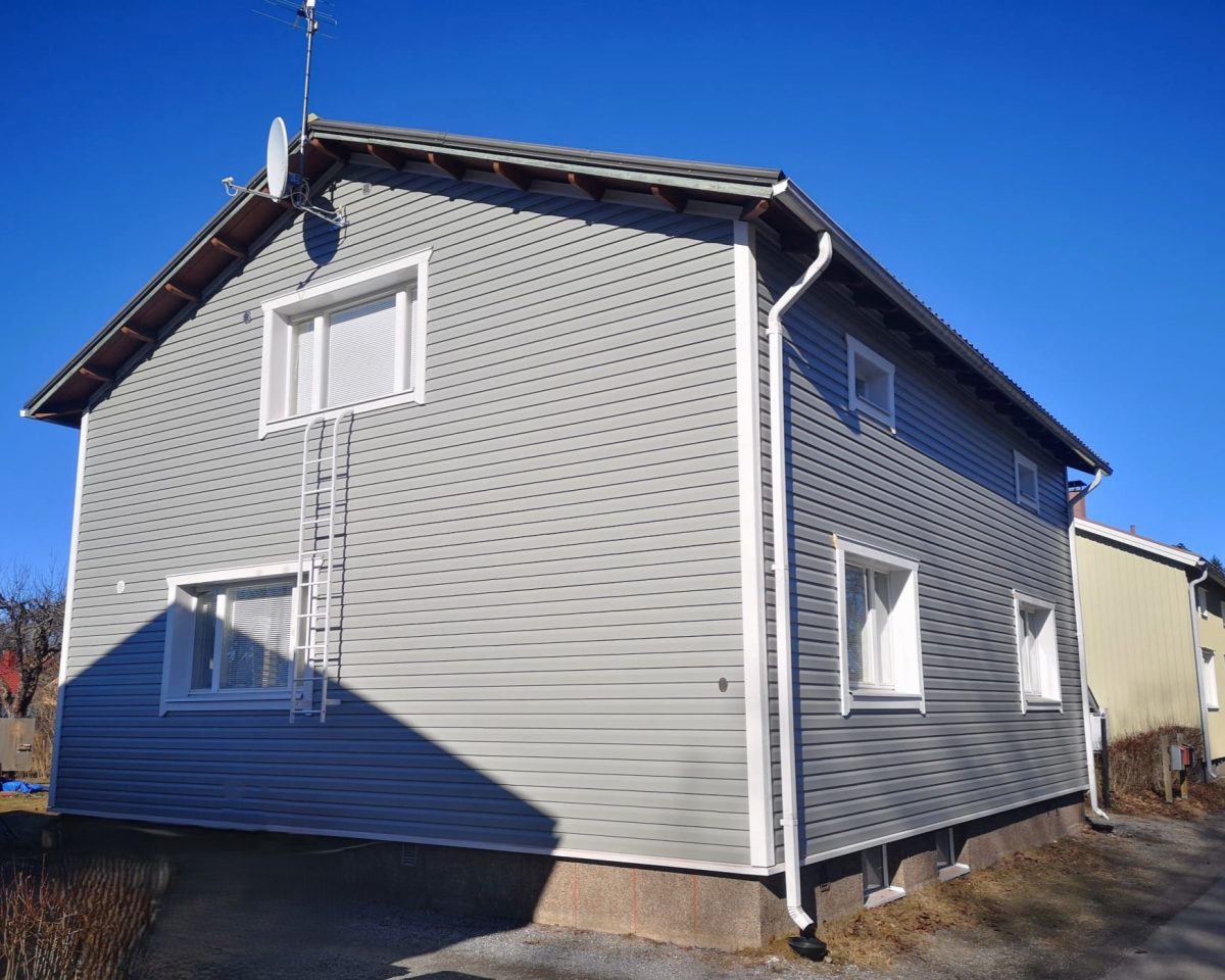 Vanhan omakotitalon puuverhous oli tullut tiensä päähän ja se vaihdettiin huoltovapaaseen vinyyliverhoukseen. Vanha verhous poistettiin, asennettiin Isover Facade tuulensuojaeriste ja kaiken kruunasi kaunis vinyyliverhous vaakapaneelointi. Räystään aluset verhoiltiin myös vinyylillä ja otsat pellitettiin. Näin talosta saatiin ulkopintojen osalta täysin huoltovapaa. Pesu silloin tällöin riittää! Verhouksen väri harmaa (Dover Gray).